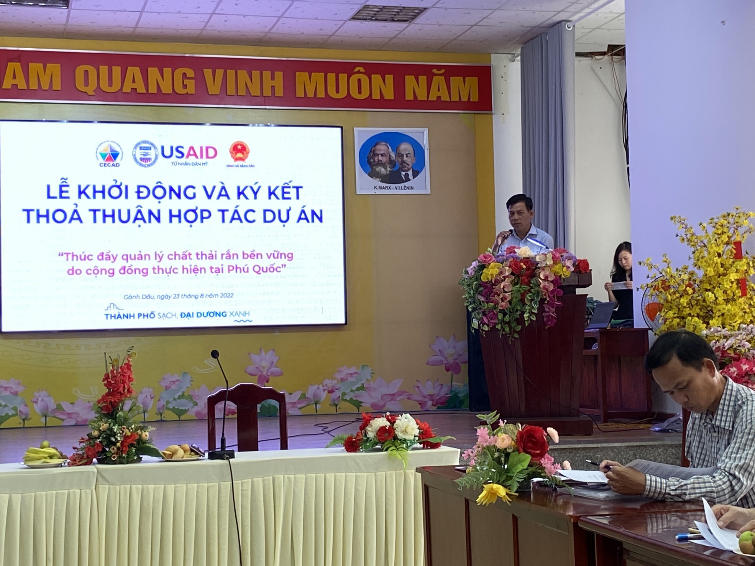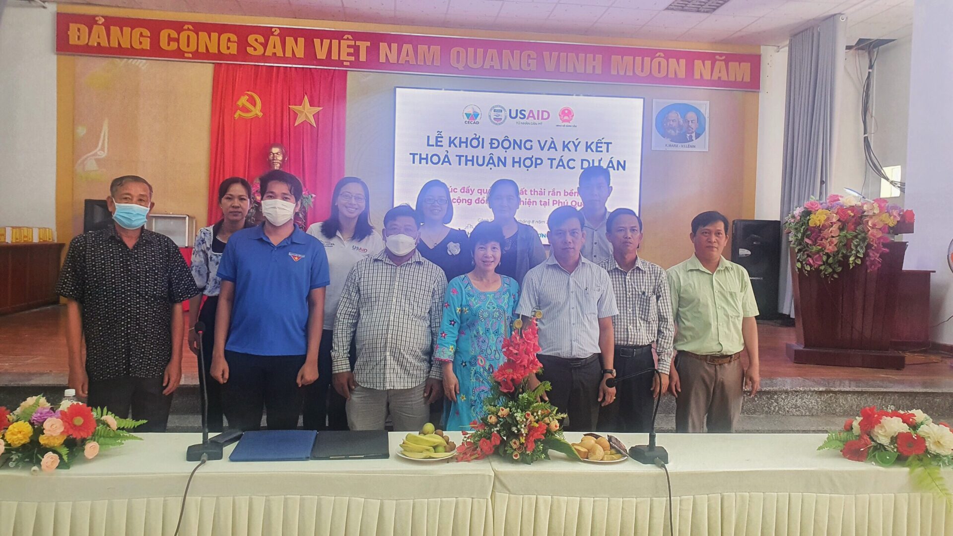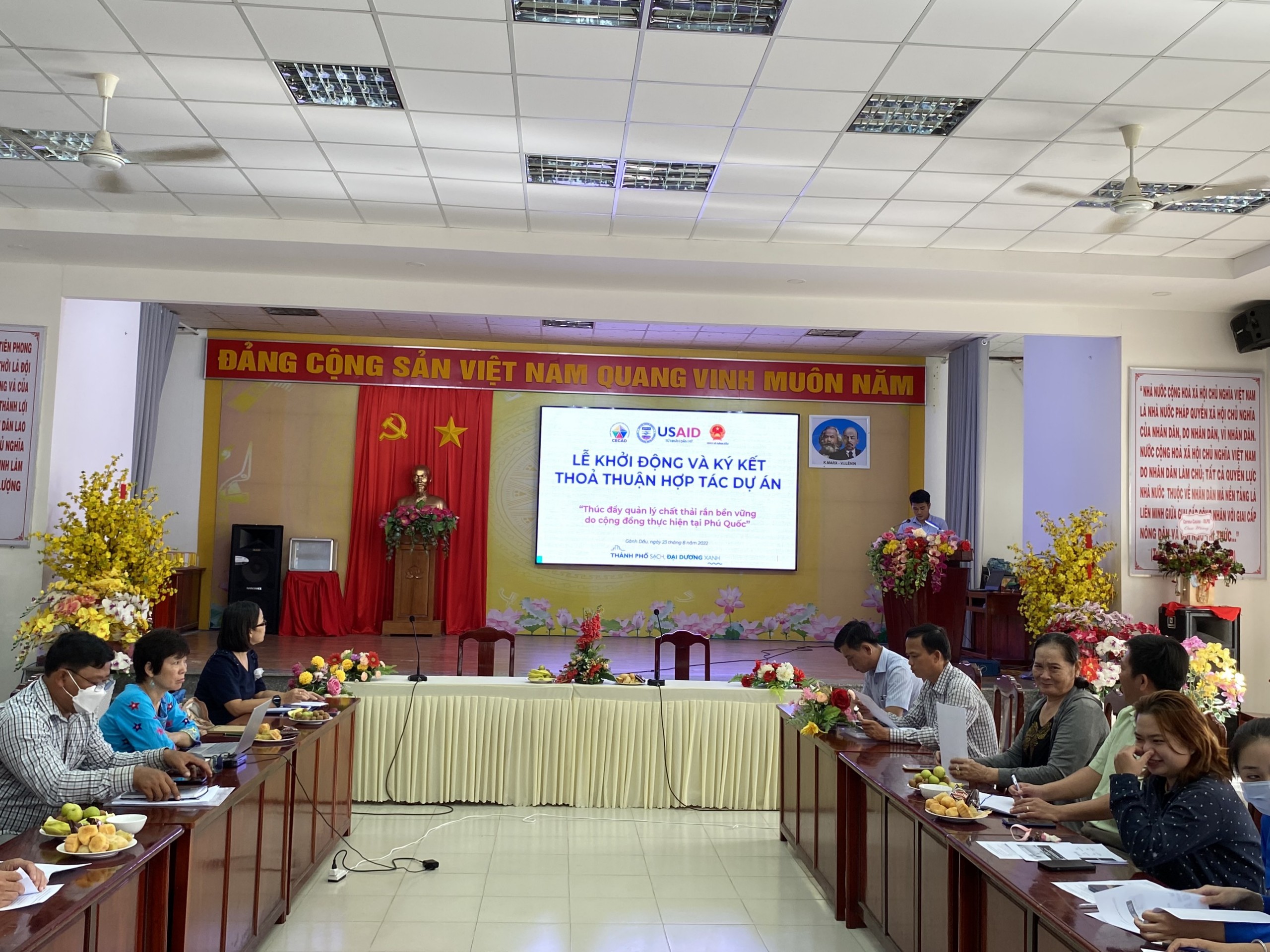 On August 22, 2022, the Center for Environment and Community Resource Development (CECAD) cooperated with the People’s Committee of An Thoi Ward and the People’s Committee of Ganh Dau Commune to organize the Agreement Signing Ceremony of the Project “Promoting quality management community-based sustainable solid waste in Phu Quoc” under the “Clean Cities, Blue Oceans” (CCBO) Program funded by the United States Agency for International Development (USAID).